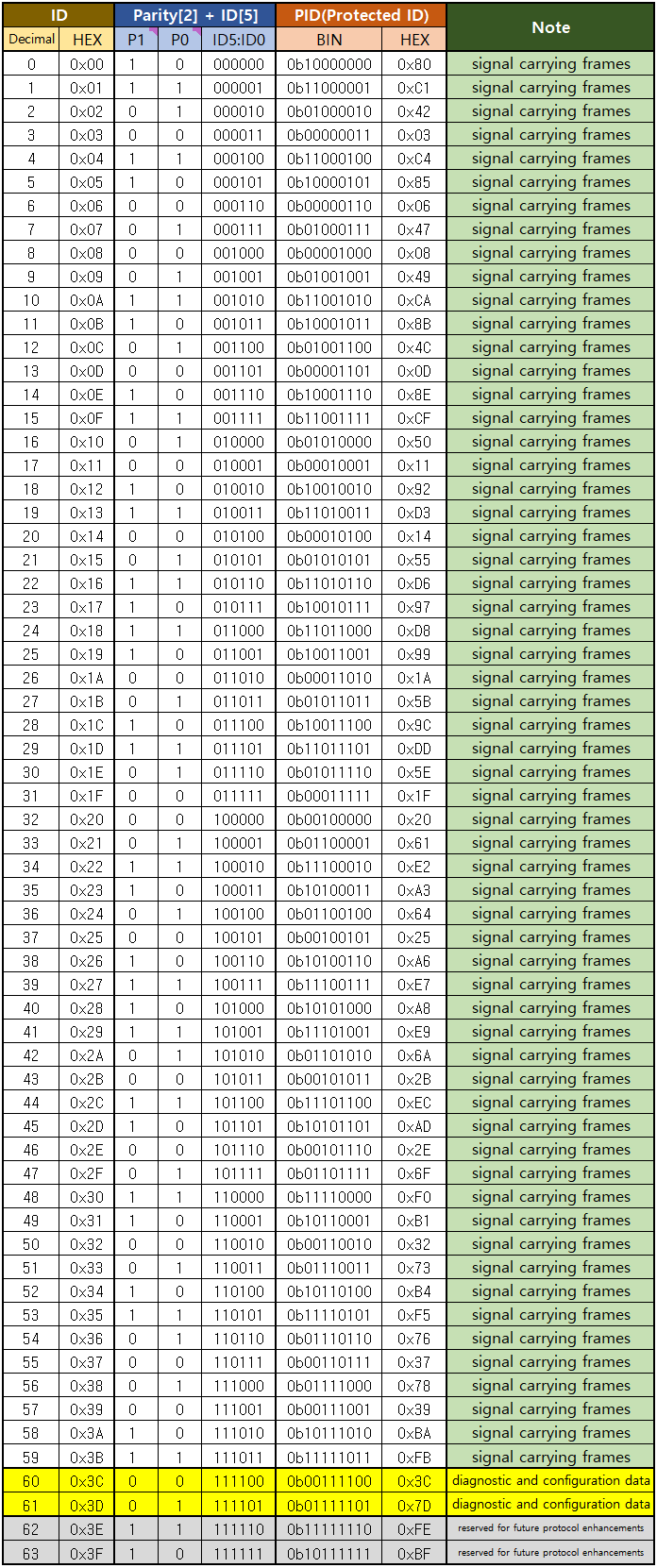 위 구조를 토대로 LIN PID Look Up Table 을 만들어 보면 아래와 같이 정리 됩니다.